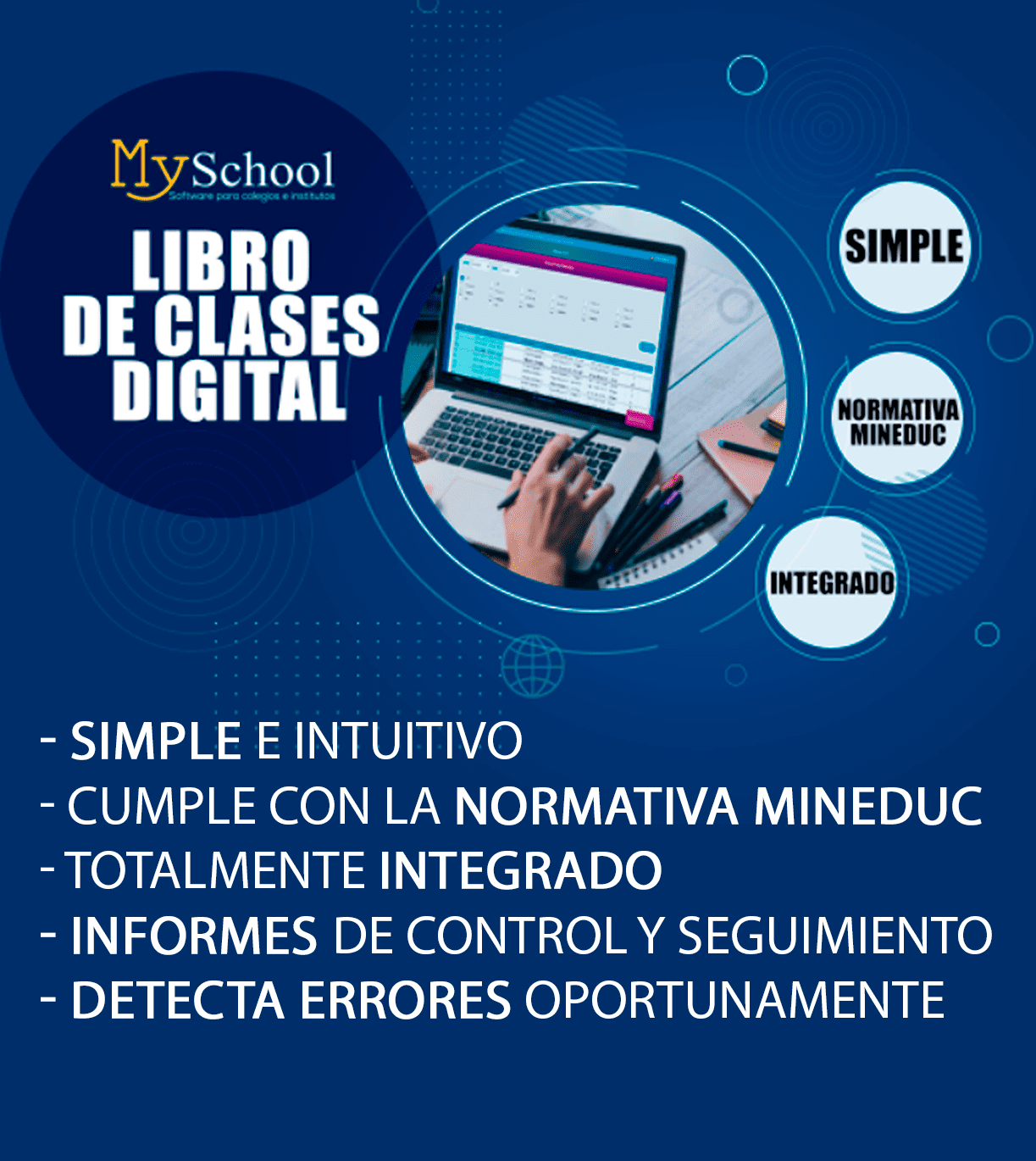 Su principal objetivo es llevar el libro de clases en forma digital, facilitando el acceso de los profesores a este, de manera simultánea y sin esperas, incluyendo la firma electrónica. Incluye todo lo solicitado por el ministerio de educación, con la facilidad propia de MySchool.