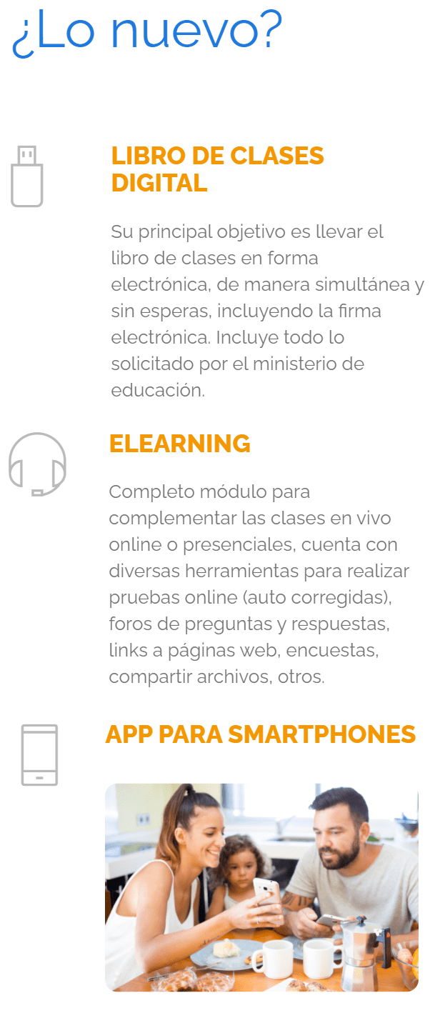 Permite el acceso a la plataforma de alumnos y apoderados. Visualización de calificaciones, hoja de vida, noticias, descarga de archivos, calendario de eventos, visualización de calificaciones, vista anotaciones del alumno.